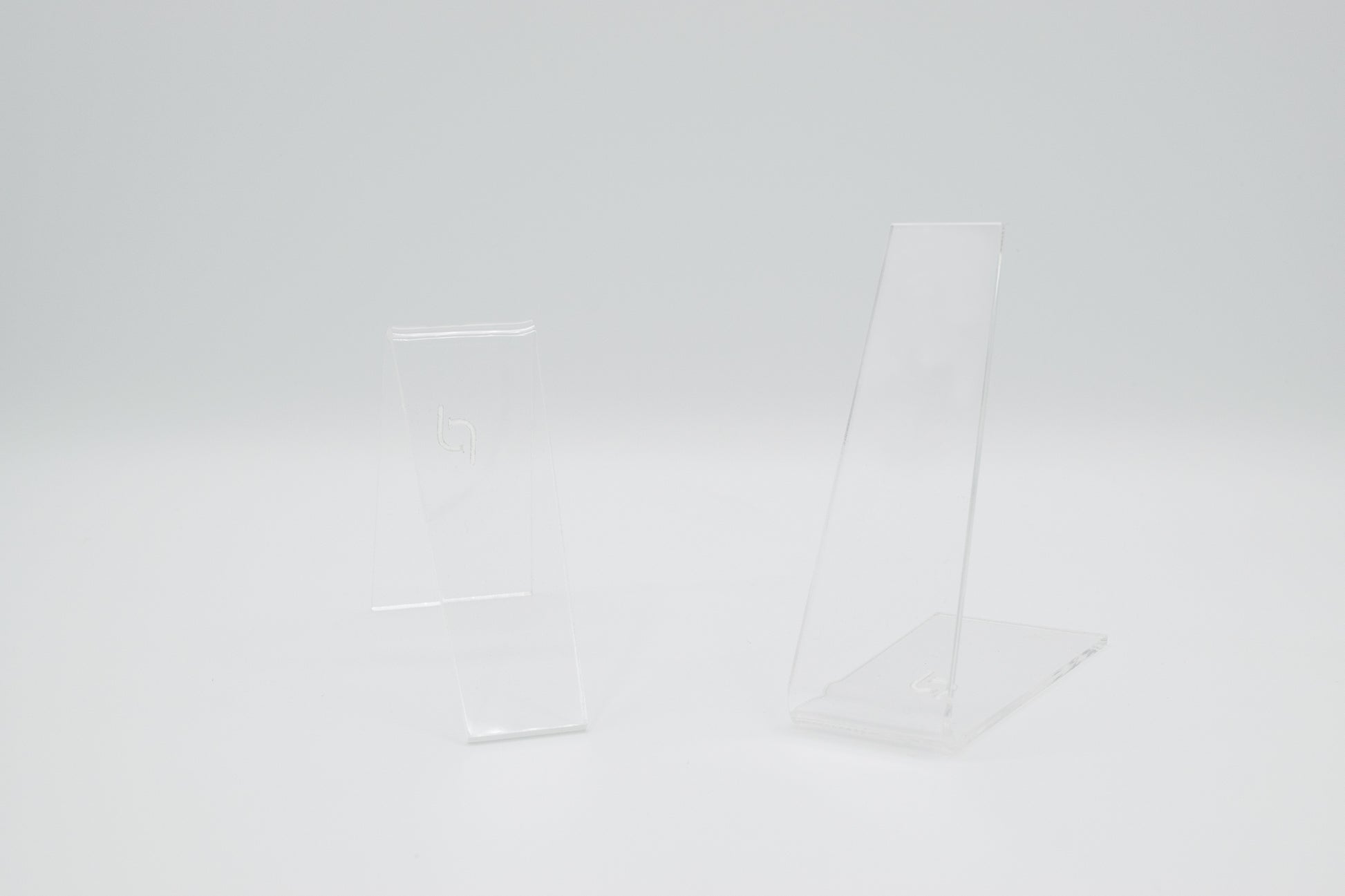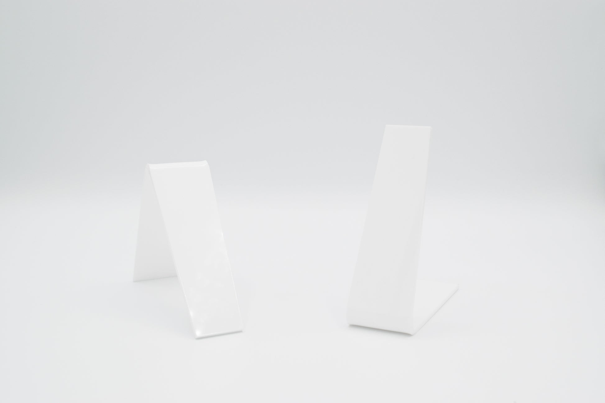 in the left setup, each stand measures 3” h × 1.75” w × 4.5” d, making it sleek and space-efficient for both trade shows and in-store displays.